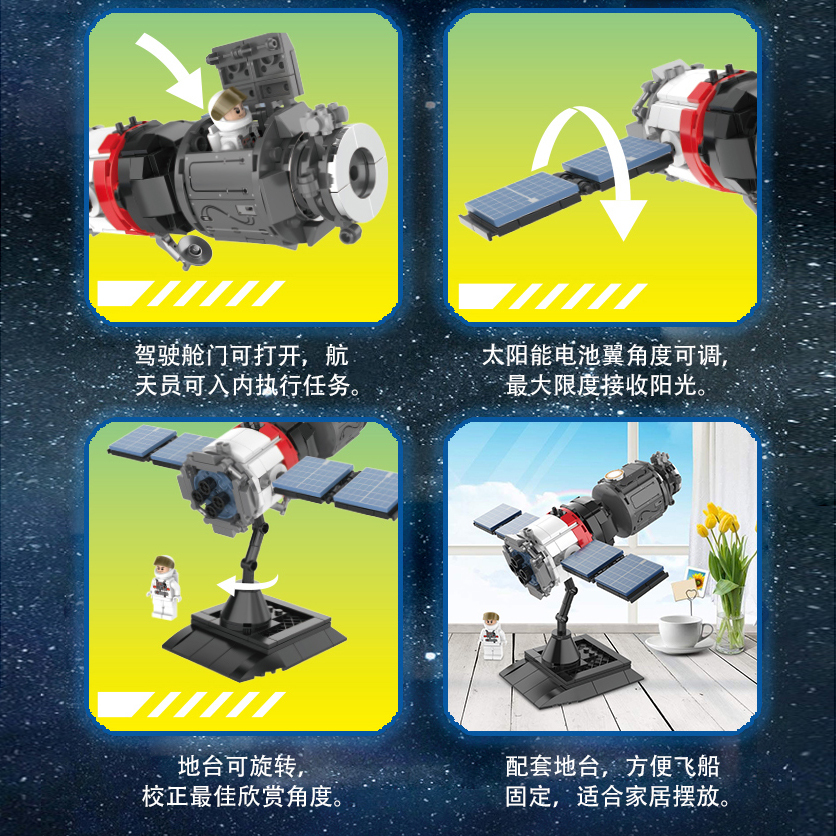 載人飛船是航天員飛向太空的專屬交通工具。蒼穹一號裁人飛船設計上沿用了中國特色載人飛船的“三艙一段”方案,即推進艙、返向艙、軌道艙和附加段。配套地臺可以手動調(diào)整最佳觀賞角度,航天員人仔可以立于地臺之上,觀賞性十足,和航天員一起進行太空探索吧!