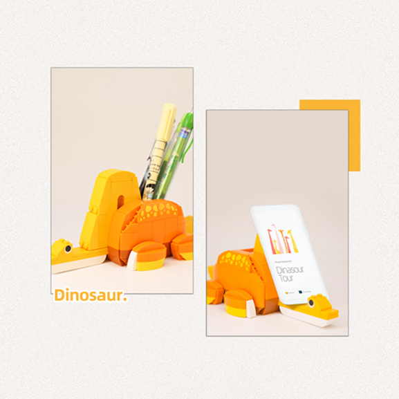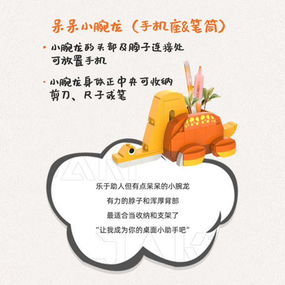 小腕龍的頭部及脖子連接處可放置手機, 小腕龍身體正中央可收納剪刀、尺子或筆。